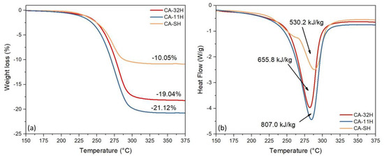 CA-32H (red), CA-11H (blue) and CA-SH (orange) thermogravimetric (TG) (a) and differential scanning calorimetry (DSC) (b) curves, recorded between 150 °C and 375 °C, scan rate 10 °C/min.