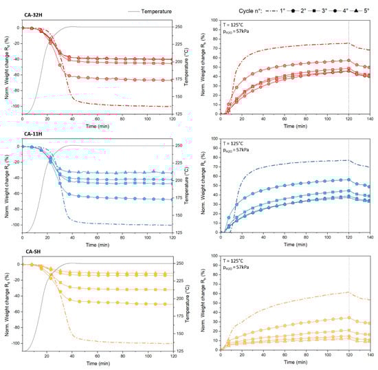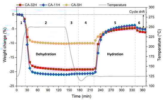 After structural and thermal characterization of as synthesized materials, cyclic TG experiments were carried out in order to assess the dehydration/hydration stability of all batches. Figure 8 shows the whole first thermogravimetric cycle for CA-11H/32H and CA-SH, and the highlighted sections 1–6 correspond to the analysis steps previously reported in Section 2.3.3 and listed in Table 3. The plot is useful to visually perceive how the material’s mass changes along each step, relating these transitions to the dehydration and hydration reactions.