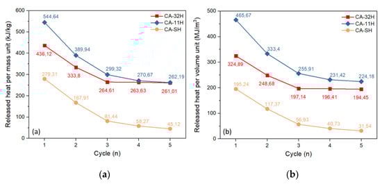 where QDSC is the previously determined dehydration heat by calorimetric analysis, R%;h(n) is the normalized hydration conversion referred to by the n cycle and ρ is the experimentally determined bulk density for the hydrated materials, corresponding to 745 kg/m3 for CA-32H, 854 kg/m3 for CA-11H and 699 kg/m3 for CA-SH. Figure 10 shows the released heat per mass unit (a) and volume unit (b) as a function of the cycle number (n).