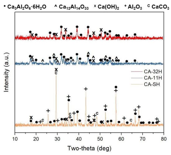 CA-SH, characterized by the lowest conversion value, still exhibited typical katoite peaks, although less intense. Similarly to CA-11H, mayenite peaks were visible as a consequence of katoite decomposition. The main crystalline phase was alumina, Al2O3, which prevented the process reversibility. In fact, the high stability of the aluminum oxide inhibited its rehydration step. Calcium oxide, which was present in the initial material, had not been identified anymore; it is very likely that the contact with atmospheric carbon dioxide led to a total conversion of the latter into calcium carbonate (Equation (12)), CaCO3, already detected on the pristine material.