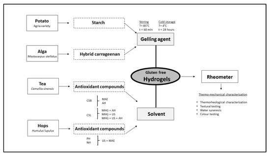 In this context, the main aim of this study is the preparation and thermomechanical characterization of alternative functional hydrogels based on potato starches and hybrid carrageenans supplemented with antioxidant compounds, which were obtained from tea pruning remains and hops pellets and were characterized by their nutraceuticals and healthy beneficial properties.
