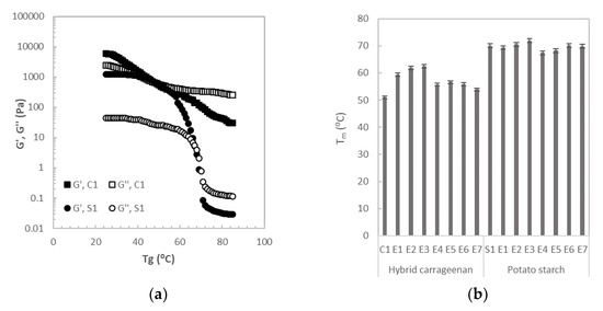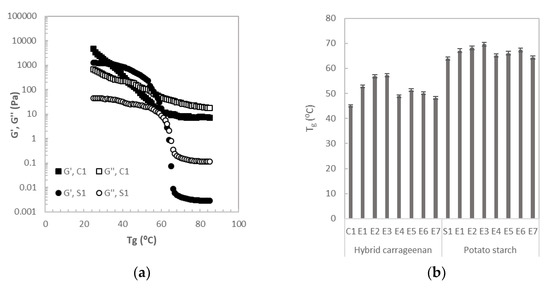 Cooling profiles for (a) the control matrices prepared with the hybrid carrageenan (C1) or potato starch (S1), as well as (b) the corresponding gelling temperatures (Tg) for all formulated matrices. Note that in this and subsequent plots, error bars were not presented when they were smaller than the symbol size.