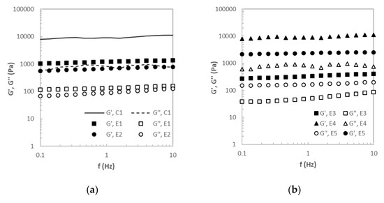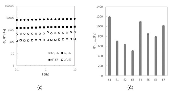 Figure 3 shows the viscoelastic properties of the above gelled matrices, taken after the cooling maturation stage. In all cases, a typical gel profile could be observed (G’ > G’’ and both moduli almost invariant over the tested frequency range) [23]. The softening of the gelled matrices in the presence of the tested extracts (E1–E7) was verified with the mechanical spectra. For the carrageenan gelled matrices, the strongest gels were found for E4 > E6 > E5 > E7 > E1 > E2 > E3. A similar tendency (E4 > E7 > E5 > E6 > E1 >E2 >E3) was identified for those formulated with starch as the gelling agent (Figure 2d), although notably lower values were obtained for the corresponding viscoelastic moduli (about tenfold). This supports the above hypothesis about the correlation between the mechanical properties and the phenolic contents of the samples. Note that the gels enriched with extracts from Camellia sinensis branches (E1) and industrial hops (E7) exhibited involved gels with close viscoelastic properties. In all cases, gluten-free gels with intermediate strengths were developed. The obtained viscoelastic values were in the range of those previously described for other gelled matrices for food purposes [22,24,25]. It should also be highlighted that after one month of cold storage, the thermorheological characteristics of the proposed gels were practically invariant, with drops in the values of both moduli being lower than 2%.