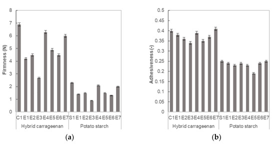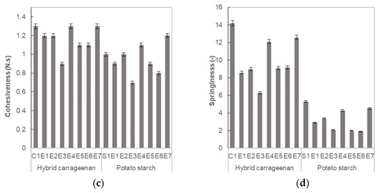 Texture parameters in terms of (a) firmness, (b) adhesiveness, (c) cohesiveness and (d) springiness for the proposed matrices prepared with hybrid carrageenan or potato starch in the presence of selected extracts (E1–E7; see Table 1). The controls prepared with hybrid carrageenan (C1) and potato starch (S1) were also included.