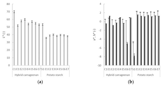 Color parameters for proposed matrices prepared with (a) hybrid carrageenan or potato starch in the presence of the selected extracts (E1–E7; see Table 1) compared with the controls (C1 and S1). The gray and black bars in the plot (b) correspond to the a* and b* parameters, respectively.