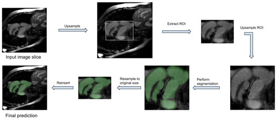 These methods operate in a 3D scenario, aiming to obtain a 3D box which encompasses the entire heart. Other methods proposed to locate the heart by focusing on motion or heart beats, based on the changes in pixel intensities [,]. A somewhat simpler approach is proposed by Wang et al. in [], where they use the output of a standard segmentation model to extract the ROI for another model, using the boundaries of the initial prediction. They used information from adjacent slices to compute the ROI for a single 2D slice.