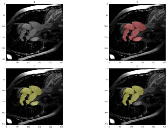 Sample results from the imATFIB validation set (Red—ground truth, Yellow—model prediction). (A) Input image, (B) Label mask, (C) All Ensemble model (), (D) U-net model ().