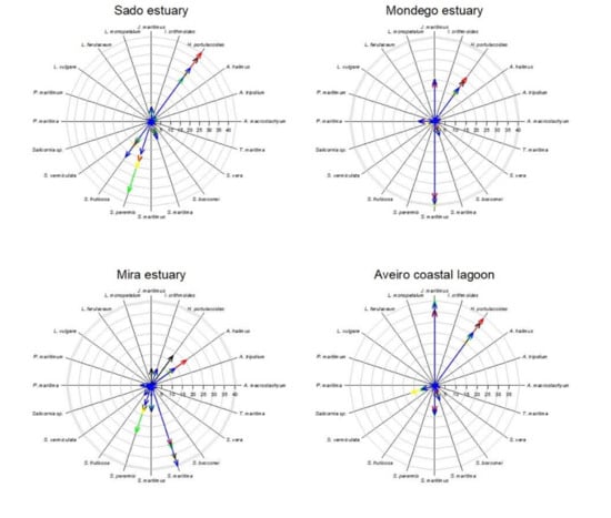 Most of the surveyed systems are dominated by Halimione portulacoides, Spartina maritima, Juncus maritimus, Sarcocornia fruticosa, and Sarcocornia perennis (Figure 2). This is a common feature of several transitional systems in Portugal [15]. Nevertheless, Portuguese salt marshes present several plant species ranging from 10 to 15 of approximately 20 possible halophytic species. The high degree of combinations both in terms of the number of species but also of its relative coverage make the different surveyed transitional systems very different in terms of salt marsh communities (Figure 3). Three major transitional system clusters can be observed based on the species coverage data. This grouping pattern reflects the latitudinal differences in the communities along the Portuguese Atlantic coast. In fact, this was already observed in terms of primary productivity and physiology for some species along the Portuguese Atlantic coast [54]. The first cluster comprises the salt marsh communities from the Tagus and Sado estuaries, both located in the central part of the Atlantic coast at very similar latitudes. Both of these systems are dominated by H. portulacoides, S. perennis, and S. fruticosa, covering between 78–80% of the surveyed marshes. A second group can also be observed in the systems dominated by H. portulacoides, S. maritima, Scirpus maritimus, and J. maritimus, such as the salt marshes from Mondego and Mira estuaries and the Aveiro coastal lagoon. The last cluster is formed by the marsh communities from the Ria Formosa coastal lagoon (the only surveyed system located at the south coast of Portugal) that are dominated by a combination of S. maritima, S. fruticosa, and S. perennis, and with a lower expression of H. portulacoides coverage. These differences in coverage greatly influence not only the present-day value of the ecosystems, but also how these will change in the future due to the impacts of predicted climate change, as these are species-specific.