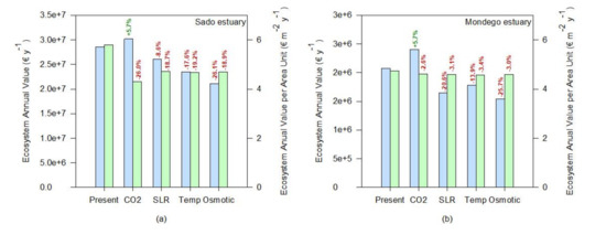 If the whole ecosystem service value is considered, a similar tendency can be observed (Figure 8). Since most of the ecosystem services are evaluated having as a basis a cost per unit of salt marsh area, the value of the transitional systems tends to increase under rising atmospheric CO2, driven from a higher salt marsh coverage (Figure 8). This was also reported by previous studies [63] using modeling approaches, suggesting that the net impact of climate change will be to increase carbon burial rates in the first half of the twenty-first century. Nevertheless, if the value of the ecosystem services is calculated having as a basis a value per square meter of salt marsh, the negative effects of climate change in the salt marsh ecosystem services are exacerbated. The average value per square meter tends to decrease either by a reduction of the colonization area through a reduction of the primary productivity of the species or due to an increased area due to higher productivity of a certain species (e.g., under rising atmospheric CO2) and a consequent dilution of the ecosystem value into a larger area, that does not all benefit from the enhancing stressor. This valuation can be taken into account not only for ecological economics purposes but also to assess the system resilience or susceptibility to climate change. At this level, the Sado estuary (Figure 8a) seems to be the system that will be more negatively impacted by the climate change scenarios considered, presenting the highest losses in terms of ecosystem services value, followed by the Aveiro coastal lagoon and the Mira and Mondego estuaries (Figure 8d,b,c, respectively). As previously noted, this is inherent to the marsh’s floristic inventories and abundance and how the most abundant species in these ecosystems will cope with climate change. On the other hand, the Ria Formosa coastal lagoon appears to have an overall reduction of the system value (Figure 8f, ecosystem annual value). Nevertheless, if the ecosystem services value on a square meter basis (Figure 8f) is considered, it appears that this system has a high resilience towards climate change. Again, this derives from the dominance of low marsh species observed in this transitional system, more resilient to many climate change-induced stressors [12,53].