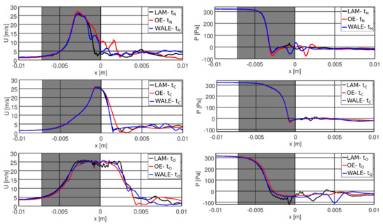 Velocity magnitude (left) and pressure distribution (right) along the glottal mid–line in three time instants (top), (middle) and (bottom). Gray background denotes the region of the moving vocal folds.