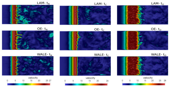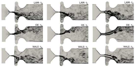 The visualizations of the vorticity fields , which are commonly used for characterizing turbulence in cases with no entrainment rotation, are shown in mid–coronal (x-y) plane in Figure 5. They reveal the shear layers, where vortices are shed as a consequence of Kelvin-Helmholtz instability. The vortices may undergo successive instabilities, leading to a direct kinetic-energy cascade towards the small scales. The supraglottal jet deflects stochastically towards either of the ventricular folds. This behavior is not a consequence of the SGS model, it is caused by the bistability of the flow in this symmetric geometry (see e.g., [46,47]).