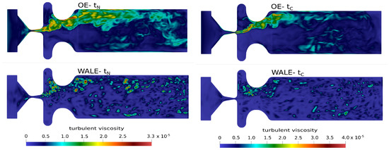 The effect of the unresolved turbulent sub-grid scales on the resolved velocity and pressure fields is carried by the turbulent SGS viscosity (see Equations (10) and (15)). Figure 6 clearly shows that the turbulent viscosity predicted by the One-Equation model is very high in regions of pure shear, especially within glottis. At certain phases of the vocal fold motion, reaches values three times higher than the molecular viscosity . In contrast to this, the WALE SGS model predicts considerably lower values, not localized in the shear layers.
