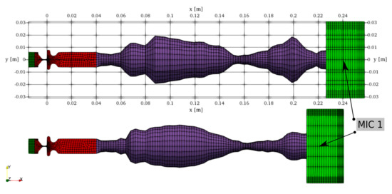 The aeroacoustic field is numerically solved by the Finite Element Method. Figure 7 illustrates the geometry and structure of the acoustic mesh. Geometries of vocal tracts for vowels [u:] and [i:] were modeled from frustums concatenated one after another. The shape of the frustums was defined according to vocal tract area functions measured by magnetic resonance imaging [53]. The vocal tracts (purple) were conformly attached to the larynx (red). The connection is formed by two hexahedral layers, with minor influence on the wave propagation. The right edge of the vocal tract is attached to the downstream radiation zone. The radiation zone is overlaid by a Perfectly Matched Layer (PML) (green) [54], with an implemented damping function to avoid reflecting waves backward. The second PML layer is inserted upstream from the inlet boundary. Microphone mic1 is located 1 cm downstream from the mouth.