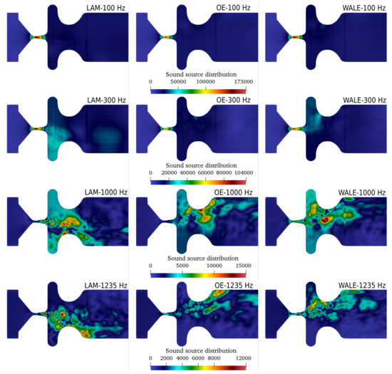 Figure 8 presents the aeroacoustic sources computed by PCWE (26) from three CFD simulations. The sources, which are a function varying in space and time, were transformed from the time domain into the frequency domain by the Fourier transform, which provides a useful insight into the spatial distribution of the sources at distinct frequencies. The first row in Figure 8 shows the aeroacoustic sources at the fundamental frequency (frequency of vibration of the vocal folds) . The strongest sources are located inside the glottis. The laminar simulation results in slightly higher source intensities than the LES simulations. This correlates with the flow rate amplitude, which is also higher in the laminar case (see Figure 2). At the third harmonic frequency , aeroacoustic sources are predicted also downstream of the glottis and in the supraglottal vestibule. Especially in laminar and WALE cases, disturbances induced in the shear layer of the jet are clearly visible. The third and the last row refer to a higher harmonic frequency and a non-harmonic frequency . At these higher frequencies, the dominant aeroacoustic sources do not occur within glottis, but in the places, where the fast glottal jet interacts with the ventricular folds and with the slowly moving and recirculating air in the supraglottal volume.