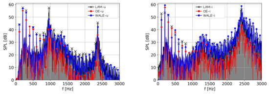 In this section, the sound pressure levels (SPL) in the frequency domain are compared. Six signals (three CFD simulations and two types of vocal tract models) were used for spectral analysis, with the frequency resolution and the Hanning windowing. The spectra of the acoustic pressure evaluated at the acoustic probe mic1 (see Figure 7) are depicted in Figure 9 for two types of vocal tracts. The vowel [u:] is characterized by formant frequencies , and [53]. The tolerable bandwidths are defined as and . The usage of SGS models does not modify positions of formant frequencies, but it modifies considerably the SPLs ( and ), see details in Table 4. The intensity of the third formant computed using the WALE model reached 42 dB, compared to 36 dB in the aeroacoustic simulation based on the One-Equation SGS model. All formant frequencies computed by the One-Equation SGS model are weaker compared to the WALE SGS model and the laminar model by 5–7 dB and 6–17 dB, respectively.