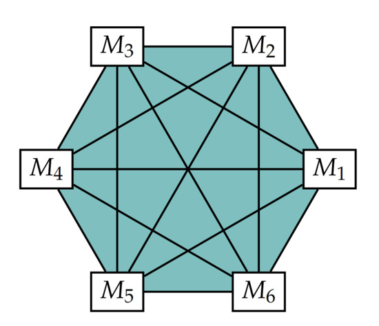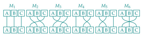 Note that this group is discrete; however, it can be represented as the set that is schematically depicted in Figure 2. This set constitutes the convex hull of the six permutation matrices given in Table 1 and is called the Birkhoff polytope [26].