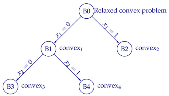 Stochastic non-linear mixed-integer problems, such as (1) to (3) are highly complicated to solve, so heuristic algorithms are commonly used to solve them [16]. However, the proposed approximations transform the problem from a general non-linear mixed-integer problem to a convex-quadratic mixed-integer model, given by (16) to (23), since the objective function is quadratic and all the constraints are linear expressions with binary components; this type of problem may be solved in practice, using the Branch and Bound (B&B) algorithm [27]. The B&B algorithm departs from a relaxed problem; in this case, the convex quadratic programming problem QP. After that, a rooted tree is generated by branching non-binary variables, as shown in Figure 3, where m refers to the entries of each matrix M that represents the Birkhoff polytope.