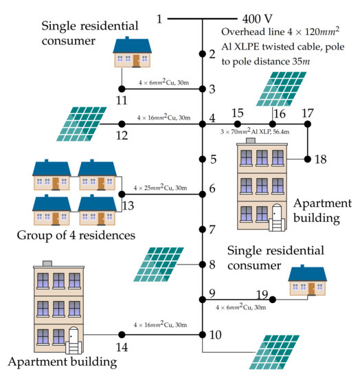 Figure 4 illustrates a modified version of the CIGRE low-voltage test system for microgrid applications. This system is a typical residential network composed of 19-nodes, with a peak power demand of 186.9 kW and a nominal voltage of 400 V. This modified CIGRE version was proposed in [28], which includes solar generations at nodes 8, 10, 12, and 16.