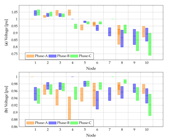 Figure 6 depicts the box-plot of thee-phase voltages, before and after the phase-balancing. This type of plot, provides a visual representation of the results under different scenarios; it also shows the minimum, maximum, median and first quartile. After the phase-balancing, the voltage profiles are enhanced by reducing the average unbalanced index from 0.3354 to 0.2921. In addition, the voltages moved to acceptable ranges between 0.9 and 1.1 pu. For example, the average of the voltages in Nodes 8, 9 and 10 was below 0.9, in the original system, and changed to values between 0.9 to 1.0 pu in the balanced system. There are, some scenarios with voltages below 0.9, even after balancing; however, this behavior occurs only in few critical scenarios.