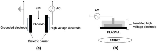 A gas discharge in which a dielectric layer covers one or both electrodes is called Dielectric Barrier Discharge (DBD) and it was first introduced by Siemens—in 1857—for the production of ozone. Large number of DBD systems has been reported [3] with the planar and cylindrical geometries as the most common employed configurations. Figure 1a depicts a typical planar DBD reactor, while Figure 1b shows the so-called floating electrode DBD (FE-DBD) [4,5]. The plasma, in this case, is formed between an insulated high voltage electrode and a target (human skin or living tissue), which acts as a floating counter electrode.