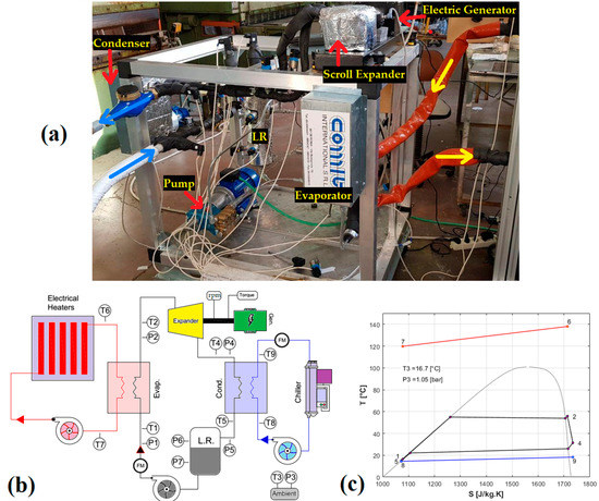 The photo of the organic Rankine cycle (ORC) test bench (a), the system schematic (b), and the temperature-entropy (T-S) diagram for a given operating condition during the tests (c).