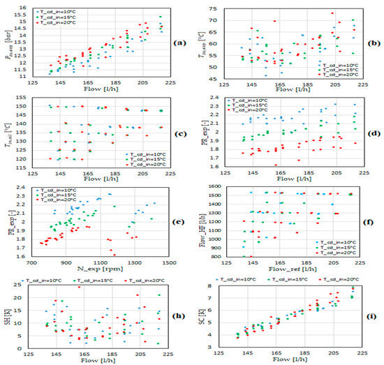 Range of the parameters constituting the experimental database: expander suction pressure vs flow rate (a), expander suction temperature vs flow rate (b), hot fluid inlet temperature to the evaporator vs flow rate (c), expander pressure ratio vs flow rate (d), expander pressure ratio vs expander shaft speed (e), hot fluid flow rate vs refrigerant flow rate in the evaporator (f), superheating degree vs refrigerant flow rate in the evaporator (h), and subcooling degree vs refrigerant flow rate in the condenser (i).