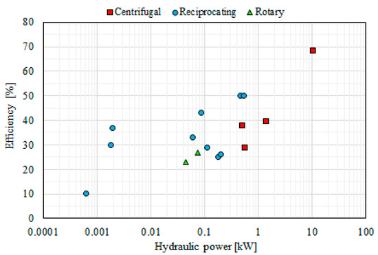 Reported pump maximum efficiency and hydraulic power in the literature up to 2017 based on data from [11].