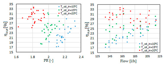The refrigerant pump isentropic efficiency with pressure ratio (PR) (left), and with flow rate (right).