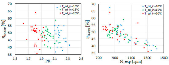 The isentropic efficiency of the scroll expander is shown in Figure 6. Most data are in the range of 40% to 55% in the range of the pressure ratio around the expander BVR. Therefore, the under-expansion and over-expansion losses may not affect the isentropic efficiency much. However, the isentropic efficiency is slightly reduced in higher expander rotational speeds corresponding to higher pressure ratios, in which the under-expansion losses occur.