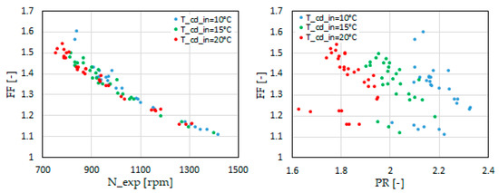 In general, it is expected that the FF is always higher than unity due to the inevitable internal leakage. Indeed, FF < 1 means the measured flow rate is lower than the theoretical flow rate of the expander. However, it is unlikely that a volumetric expander produces power while its cambers are not filled by the gas. This effect was observed in several experimental studies on scroll expanders and is defined as “under-filling” of the suction chamber [10,14]. Nevertheless, the authors believe that FF<1 is because the suction density of the expander was calculated using the temperature and pressure measured at the expander suction pipe, while the real gas density that enters the expander chambers may differ considerably due to the pressure drop between the expander suction pipe and the suction port of the scroll revolute. Therefore, a conclusion of under-filling should be deduced with caution.