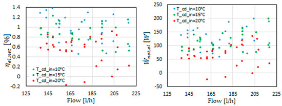 The net electric efficiency and power of the ORC system are presented in Figure 9. The low and, in a few cases, even negative values are due to the low isentropic efficiency of the refrigerant pump working in off-design conditions as mentioned before. Indeed, the present test bench had been initially designed to study the performances of different expansion devices such as the scroll compressor of this study while the net efficiency of the system was not of concern. Thus, the pump was adopted considering its ability to generate a wide range of pressure and flow rates to supply the expander machines at different working conditions.