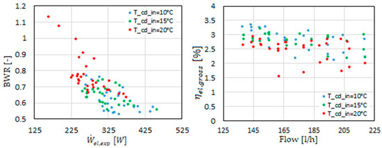 The gross efficiency is also used here since the refrigerant pump selected for the tests operates in off-design conditions resulting in low isentropic efficiencies, which leads to negative net electric efficiency for some points. To better understand the impact of the pump, the back-work ratio (BWR) is presented as follows: