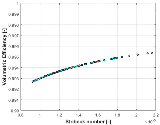 Therefore, the pressure drop of the hot fluid was calculated as the sum of Equations (13) and (15) to calculate the non-dimensional viscosity for all experimental data points. The resultant volumetric efficiency of the oil pump for the experimental database is shown in Figure 12 confirming the reliable performance of the oil pump in the temperature range of the tests.
