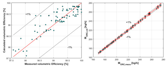 The different components of the ORC system are represented by semi-empirical models tuned using the experimental data obtained during the tests. Hence, it is possible to assess: (i) the volumetric efficiency of the hot fluid pump; (ii) the heat transfer in the plate heat exchangers (PHEs); (iii) the volumetric, isentropic, and electromechanical efficiencies of the refrigerant pump; (iv) and the scroll expander isentropic and volumetric efficiencies.