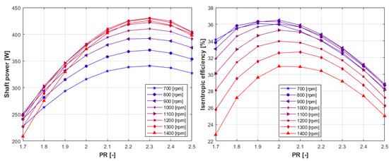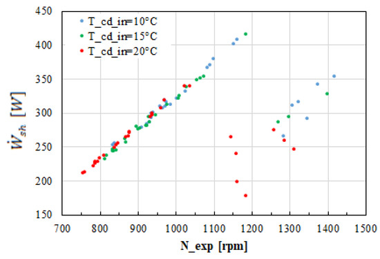 The expander shaft power is presented in Figure 7, showing that the scroll expander produced up to a maximum of 450 W approximately in a range of relatively low shaft speeds. Higher shaft power is produced at higher shaft speeds, while the isentropic efficiency is penalized as mentioned. In addition, the shaft power increases slightly in higher pressure ratios.