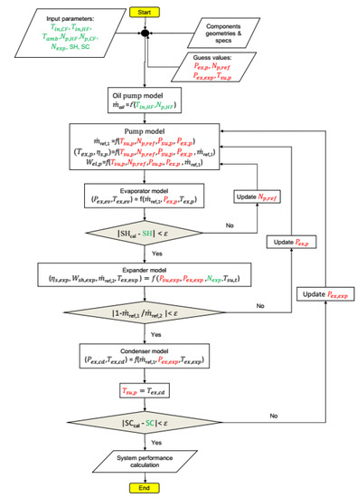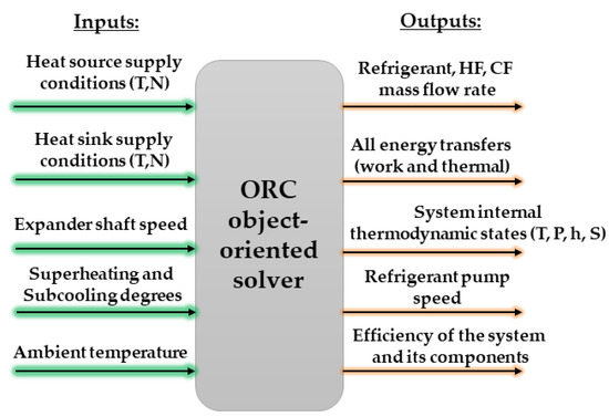 The system solver was developed in MATLAB©, and these models are referred to by the solver as functions. The solver is used to map the net electric performances of the system by changing the heat source temperature and the expander shaft speed when the other boundaries are fixed.