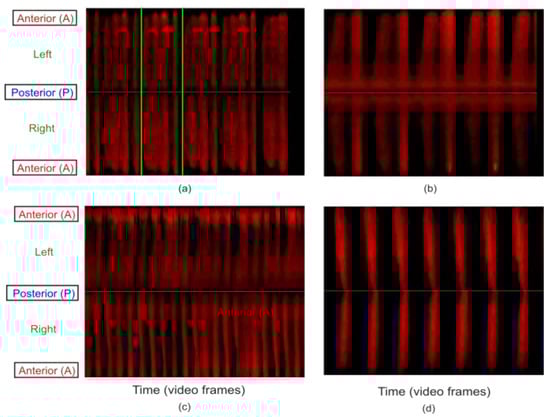 Phonovibrogram (PVG) representation of vocal fold kinematics of the GAWs shown in Figure 2: (a) CAMP = 4, (b) CAMP = 2, (c) AAMP and (d) euphonic type.