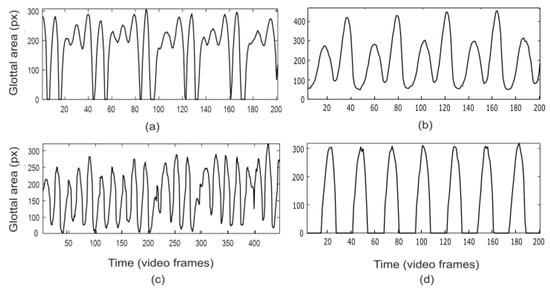 Glottal area waveforms (GAWs) extracted by segmentation of the high-speed videos (HSVs): (a–c) vocal fry and (d) euphonic voice. (a) illustrates an example of a CAMP = 4 type GAW, having four pulses in a modulator cycle; (b) illustrates an example of CAMP = 2 type, where each modulator cycle contains two pulses; and (c) belongs to an example of the Acyclically Amplitude Modulated Pulse train (AAMP) type, which is acyclically modulated. The euphonic GAW has smaller amplitude modulations than the vocal fry GAWs.