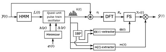 Figure 4 shows the block diagram of the analysis-by-synthesis approach used in the analyzer to model input GAWs. A similar approach was proposed in the past to model diplophonic GAWs [] where two simultaneous fundamental frequency () tracks were used. In this study, instead of two tracks, only one track is estimated. First, the track of the input GAW is extracted by a hidden Markov model (HMM) combined with repetitive execution of a Viterbi algorithm. An unmodulated quasi unit pulse train is generated by an oscillator driven by the extracted track. The pulse locations of this pulse train approximate the time instants of the maxima of the input GAW. An additional pulse train for indicating the locations of the minima of the input GAW is obtained by phase shifting the train’s phase by . The instantaneous phase and amplitude of the maxima and minima are extracted from the quasi unit pulse train, which is explained in detail in Section 2.5.