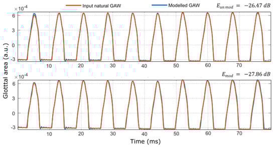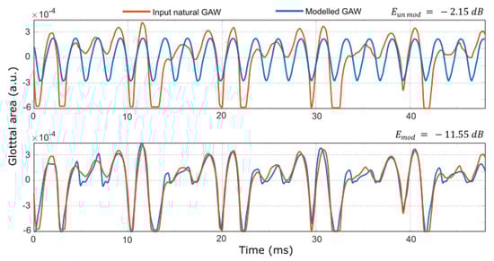 Figure 6 shows waveforms involved in the modelling of an example of a euphonic GAW using the nonmodulating model (top plot) and the modulating model (bottom plot). The modulation is negligible as compared to what is observed in vocal fry GAW in Figure 5. Thus, the GAWs modelled by the two models are similar which makes the difference between the modelling errors smaller compared to the difference between the modelling errors obtained for the GAW shown in Figure 5.