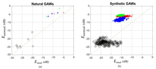 Scatter plots of the modelling errrors vocal fry GAWs and other types of GAWs: (a) natural and (b) synthetic GAWs.