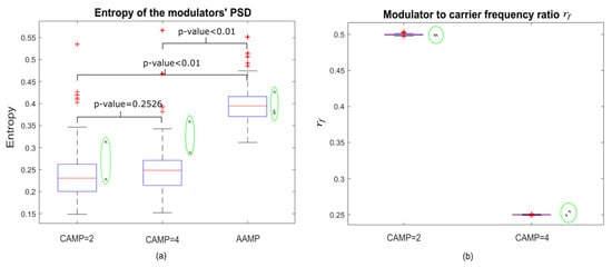 where , is the probability distribution of the modulators’ power spectrum , is the discrete Fourier transform of the modulator and is the total number of discrete frequencies . To distinguish between CAMP = 2 and CAMP = 4 GAWs, the modulator-to-carrier frequency ratio , where the modulator frequency is the frequency corresponding to the maximal magnitude of the modulator’s spectrum and is the carrier frequency estimated using the time instances of the quasi unit pulse train. A pairwise statistical comparison is conducted to check the variability of the two features, i.e., the entropy of the modulator spectrum and the ratio, in terms of p-values between the different subtypes of vocal fry GAWs.