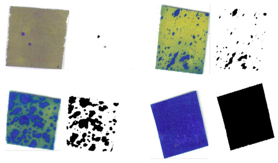 Some examples of single water-sensitive papers extracted by extraction algorithm (on the left in each pair) and black and white images obtained after transforming all ‘blue pixels’ to ‘black’ (on the right in each pair).