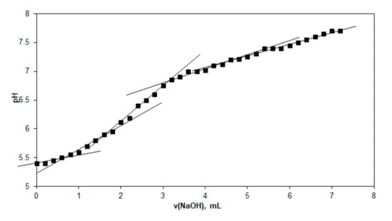 The potentiometric curve of beta-keratose hydrogel is illustrated in Figure 4. The curve consists of three straight segments, one red and other two blue having two points of intersection (volumes of equivalence).