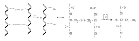 Splitting reaction of disulfide bond from keratin oxidation to sulfonic groups.