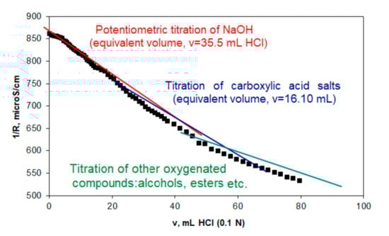 The red curve is the titration of the excess of NaOH (present on obtaining the hydrogel) up to the first volume of equivalence. The second line segment is the second equivalence volume. From here to increasing values the titration of salts of other oxygenated compounds (alcohols, esters, etc.) begins.