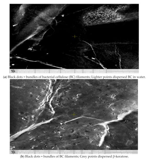 In the Figure 5c above the BC-γ-keratose SEM image revealed a more homogeneous organization. The γ-keratose (the soluble component resulting from the hair hydrolysis) is observed on large portions, as a light dispersion medium. The material contains small molecular weight keratin fragments and favors their dispersion. The dark-colored of BC bundles appear as dots shape.