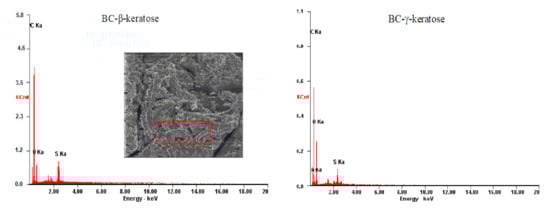 Figure 6 and Table 2 below demonstrate that the BC biomass and keratose solution have the characteristic elements of protein chains: C, O, and N, and S as a specific element in the disulfide of cysteine fragments, possibly fragments with sulfonic functional groups, explaining the solubility of gamma-keratose compared to the insoluble portion of beta-keratose resulting from hydrolytic cleavage. The analysis of the biomaterial consisting of the keratose range containing small molecular weight fragments and cysteine fragments with high frequency of sulfonic groups was chosen.
