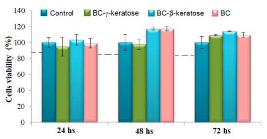 An important aim of the wound dressing’s material is to achieve an appropriate and efficient way for soft tissue regeneration which often consists of a large compartment of the cells-rich medium. Figure 7 illustrates the results obtained on bacterial cellulose (BC) and BC-keratose scaffolds, all seeded with stem cells. The relative metabolic activity induced by the scaffolds was over 95% and dependent of the scaffold composition.