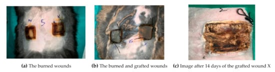 For the clinical testing of the scaffolds, eight common breed rabbits were included. A general clinical examination was performed before anesthesia and included the assessment of the habitus, skin and mucous membranes, the examination being repeated and post-intervention. The results also depend on various co-morbidities, in multicellular organisms, both health and disease are defined by means of communication patterns involving the component cells. Clinical supervision was performed daily throughout the experiment; no changes in the physiological state were reported in the rabbits included in the study [,,,]. The appearance of the wound was followed and a favorable evolution was observed after the graft. One noticed the obvious recurrence of hairs throughout the wound contour, the absence of inflammation, and after taking biological samples for anatomic–pathological tests, the revascularization of the tissue [,]. Palpation of the area shows a hard, normal appearance, without a painful sensation. The evolution of wound recovery is presented in the next images (Figure 8), where, M is the wound grafted with biomaterial made of BC-β-keratose and X wound grafted with biomaterial of BC-β-keratose and artificial tegument.
